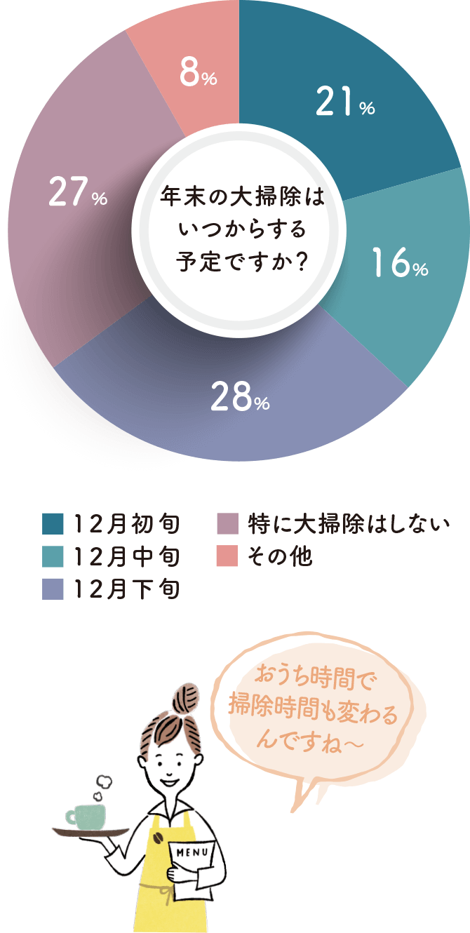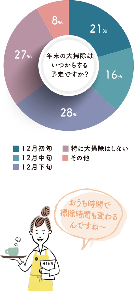 「普段掃除しない所を11月中旬あたりから週末に1ヵ所ずつ行なう」や「12月に入ったら少しずつ普段しない所を掃除していく」など、早めに始める方が増えているようです。