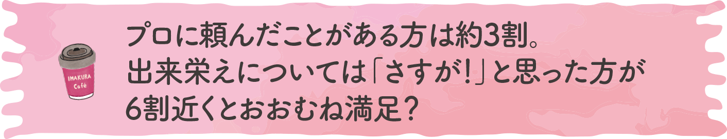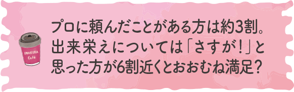 出来栄えについては約1割の方が、「え?この程度?」と思った点はやや気になりますが、「エアコンの掃除で排気口から真っ黒い水が出てくるところを見て、素人ではできない掃除方法であり、これからもプロの方にお願いしようと思った」や「換気扇の油汚れがさっぱりしたので、使うたびについつい触って確かめて悦に入っている」など、納得したエピソードも。「さすがプロ!」と感心された方が58%と満足度は高いようです。