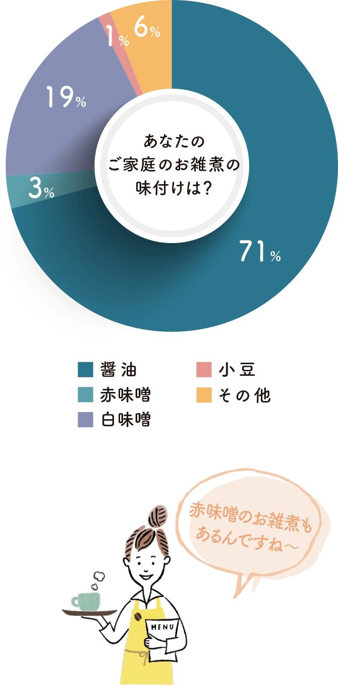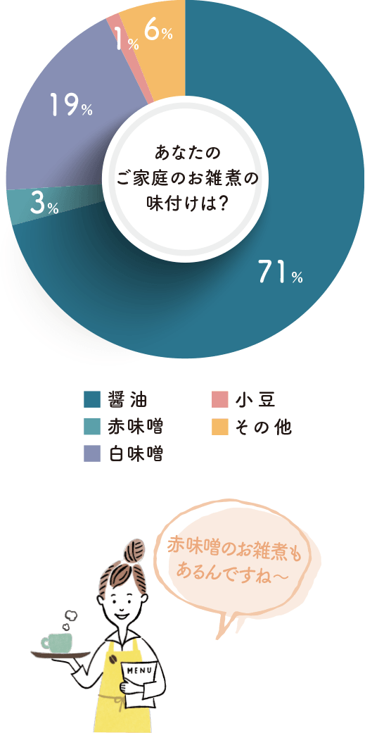 お雑煮といえば、「元旦から数日にわたって食べる、お餅が入った汁仕立ての料理」という点では一致しているものの、具材や味付けはバリエーション豊かで、「違う料理なのでは?」というくらい全国各地で違っています。東日本では焼いた角餅を入れた醤油仕立てが好まれ、関西や四国ではゆでた丸餅を入れた白味噌仕立て、そして中国・九州地方ではゆでた丸餅を入れた醤油仕立てのお雑煮が多いようです。会員のみなさんはどんな味付けのお雑煮を食べているのでしょうか?圧倒的に多かったのが「醤油」派で、約7割に上りました。次いで「白味噌」派が約2割で、少数ながら「赤味噌」派の人もいました。