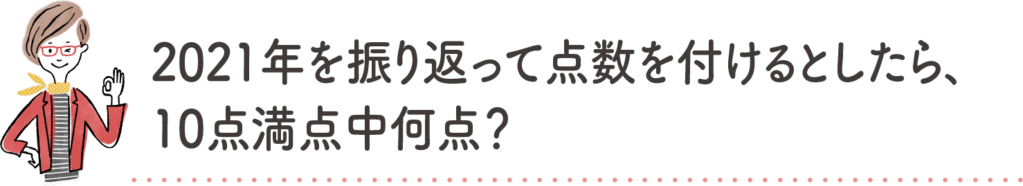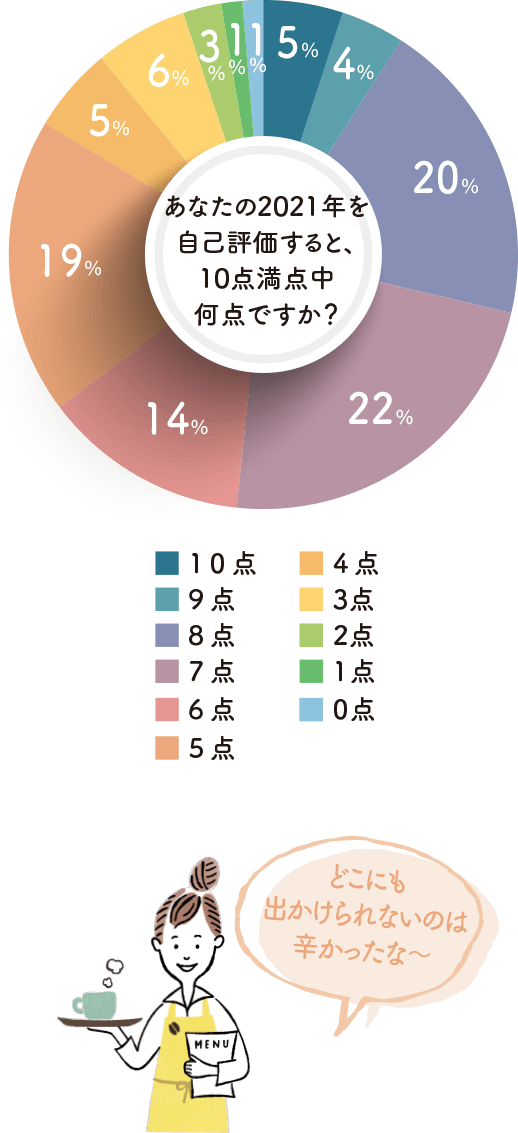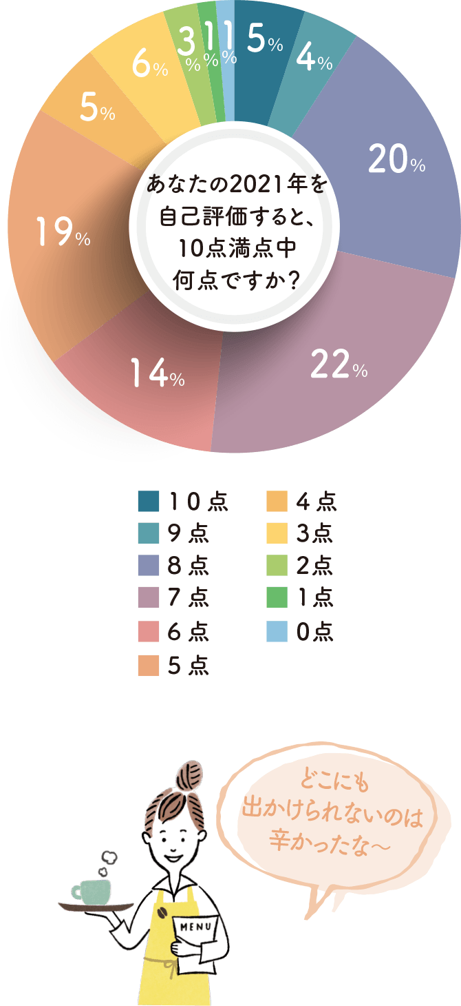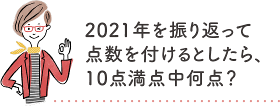 コロナ禍というストレスのかかる状況で、楽しみにしていた旅行やコンサートに行けなかったり、ホームパーティーが開けなかったりと、思い通りには過ごせなかったことも多かった2021年。一方で、おうち時間が増えてプライベートが充実したり、リモートワークが普通にできるようになったりと、有意義に過ごせた人もいると思います。あなたの2021年に点数を付けるとしたら、10点満点中何点ですか?会員のみなさんの答えは、7点(22%)、8点(20%)、5点(19%)の順でほぼ横並び。10点満点と答えた評価の高い人も5%いました。逆に0点、1点など低く評価した人はごくわずか。「けっこうがんばった」という人、「まあまあかな」と思った人が多い印象です。