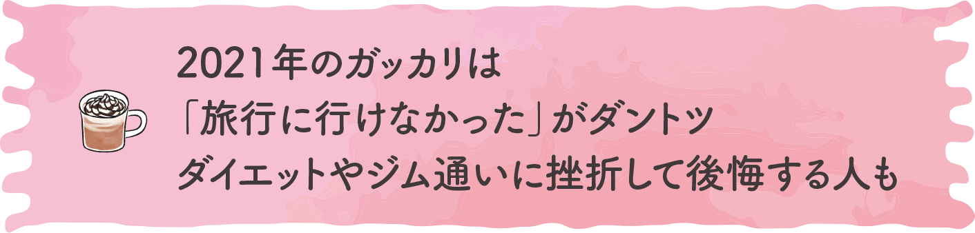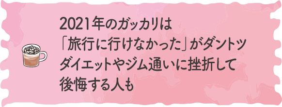 2021年を振り返って、「やり残したこと」や「後悔していること」はありますか?会員のみなさんに聞くと、やはりコロナ禍による自粛の影響が大きかったようです。「旅行ができなかった」をあげた人がダントツでした。「2年続けて海外旅行ができず悔しい!」、「恒例のハワイ旅行が取りやめに(涙)」、「楽しみにしていた趣味の全国大会が中止になった」、あるいは「実家に帰省できなくて無念」、「田舎のお墓参りに行けずじまい」といったお嘆きの声がたくさん寄せられました。