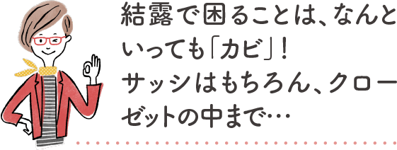 また「クローゼットの中のコート類にカビが生えた。まさかそこまで影響が出るとは思ってもいなかった」や「和室の畳がよれた」など、クローゼットや日当たりが悪い場所で起きることもあるようです。さらには「結露でカビが生えているところで作業していて、咳が止まらなくなったことがあります」と、健康への影響についてのエピソードもあり心配なところです。