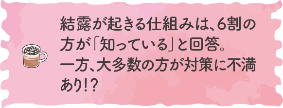 敵を倒すにはまず知ることから!結露とは「空気中に含まれる水蒸気が、冷たい物体(ガラスなど)に触れて冷やされることで、気体から液体に変わる現象」です。アンケート結果では、60%の方がこの仕組みを「知っている」と回答。知らない人が多いと思いきや、意外とみなさんご存じなのですね…!