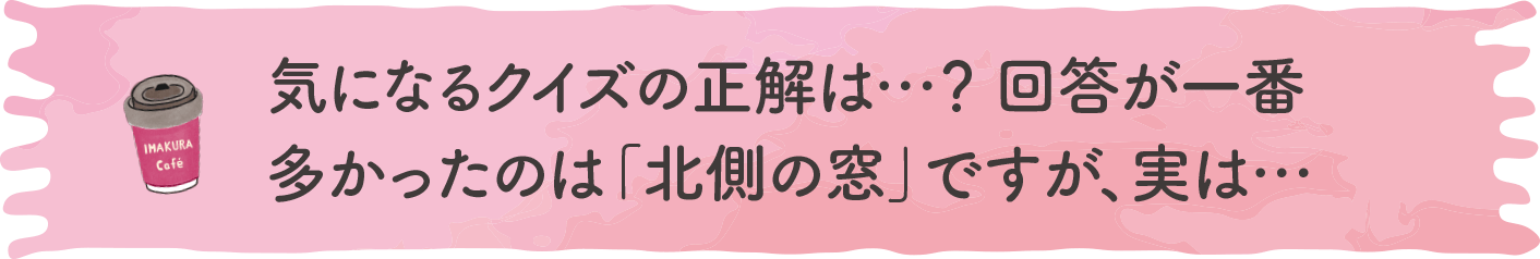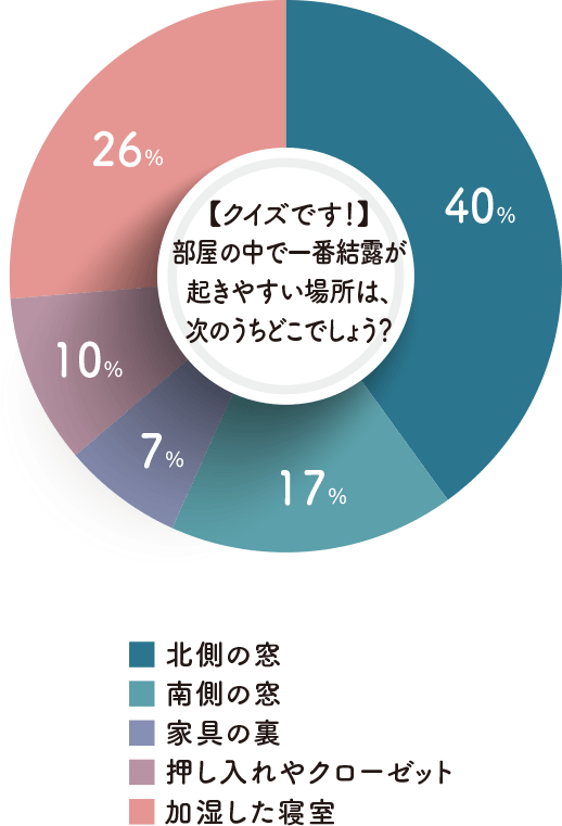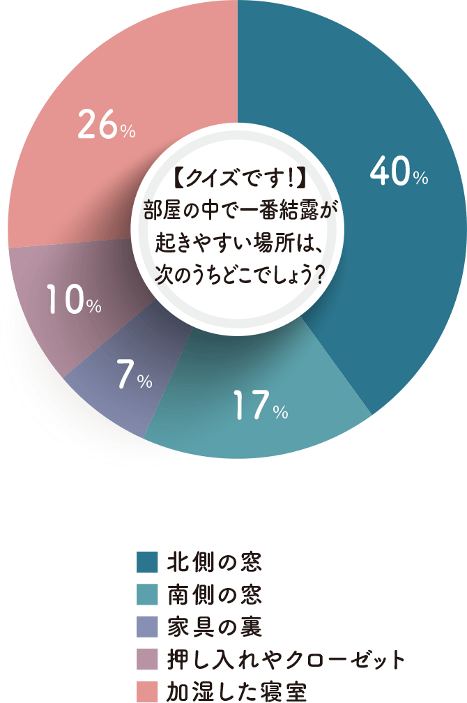 「部屋の中で一番結露が起きやすい場所は?」の答えは、実は5つの選択肢(「北側の窓」「南側の窓」「家具の裏」「押し入れやクローゼット」「加湿した寝室」)どれを選んでも正解です。