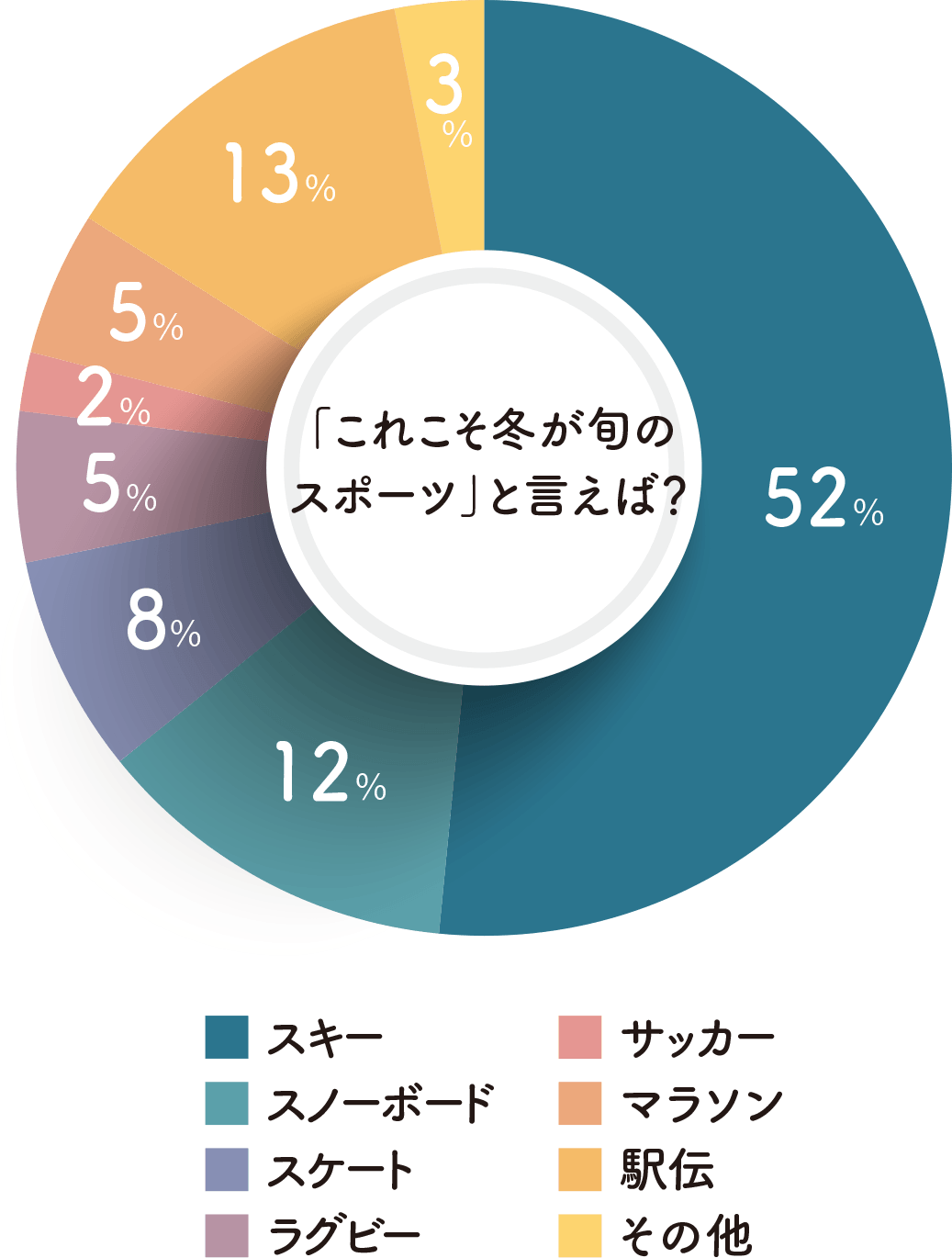 昨今はスノーボード(スノボ)が流行りなのかと思いきや、52%とぶっちぎりでスキーが1位でした。「やはり雪の中を滑るスキーは冬のスポーツNo.1だと思います」と根強い人気。次点は「スノーボード」。「会社の若者は全員スノーボード」という声もあるように、比較的若い世代に親しまれているようです。