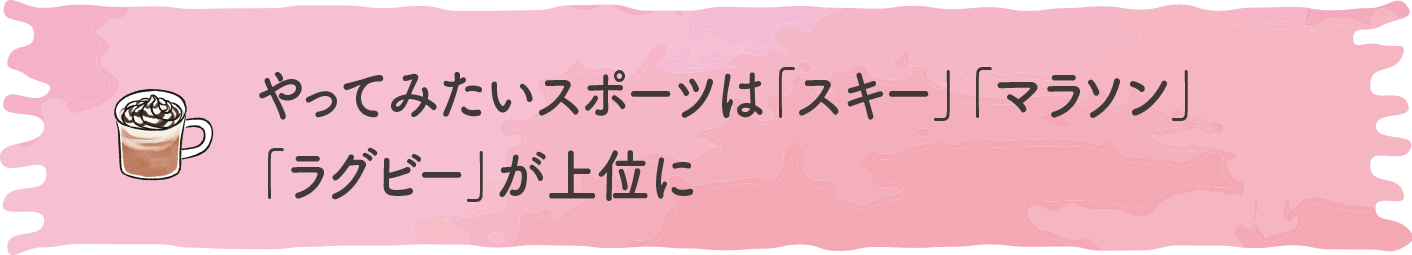 やってみたい(やっている)スポーツでも、やはり「スキー」を挙げられる方が多数を占めました。なかでも50代、60代の方に多かったのが「最後に滑ってからもう40年になるスキーを改めてやりたいなぁ!」「スキーを若い頃にずっとやっていたので、数十年ぶりに再開してみたい」などの、「久しぶりにチャレンジしたい」という方々。確かに80~90年代は、若者が冬にスキーやスノボをしに行くものでした。懐かしい…。