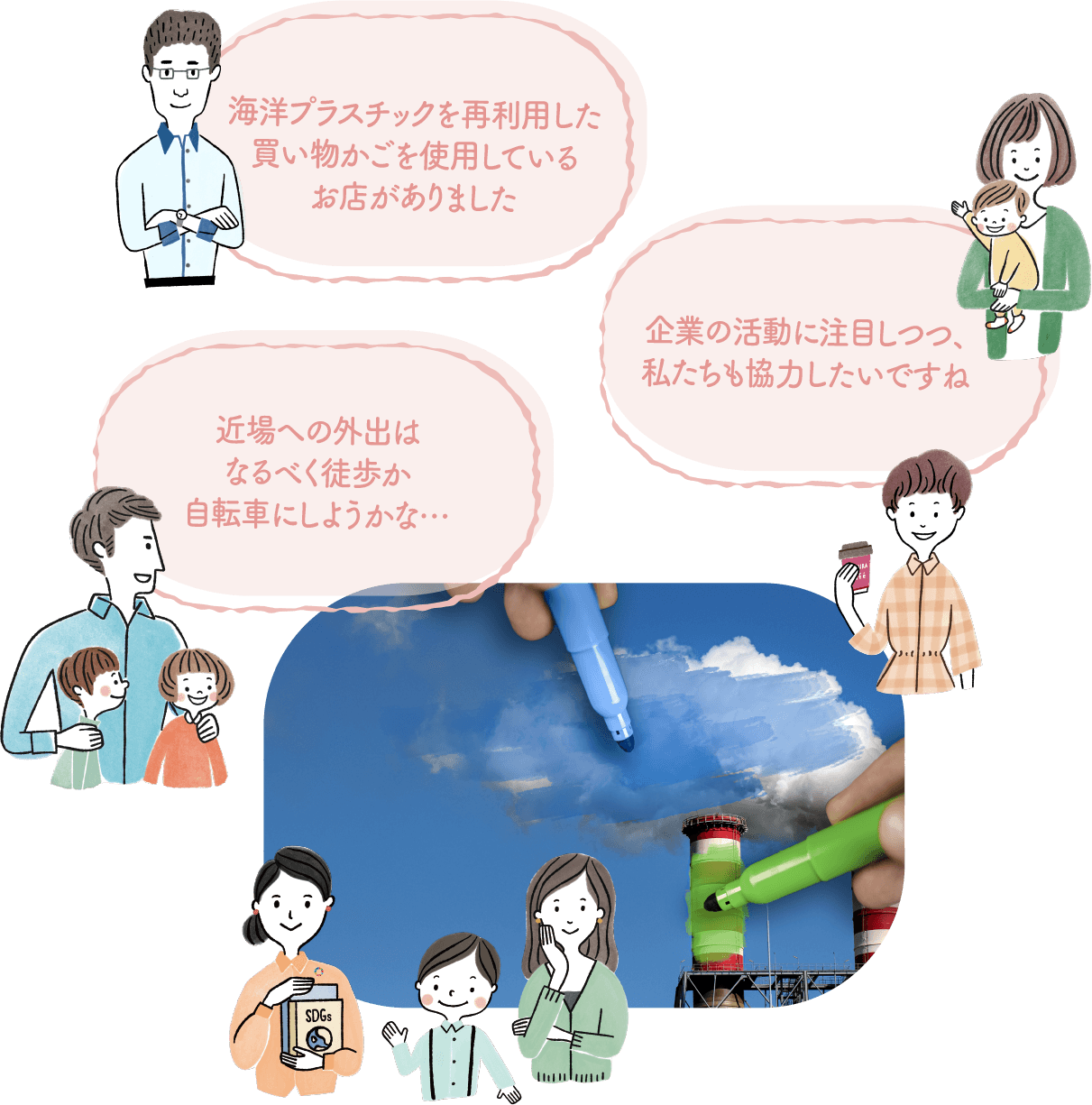 ある天気のよい日曜日。小学生の男の子とお母さんが一緒にお出かけをしたとき、マンションの建設現場を通りかかると、仮囲いに描かれたSDGsのマークが目に飛び込んできました。特に目立っていたのがSDGs目標13のマークで、「気候変動に具体的な対策を」と書かれています。それを見た男の子は「ボク、学校で習ったよ」と得意顔。少し先には、前に立ち寄ったCaféが。「ちょっとお茶の時間にしようか」とCaféに入ると、常連さんたちがSDGsと「脱炭素」について話していました…。