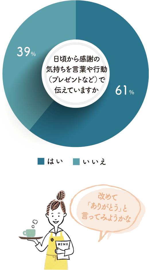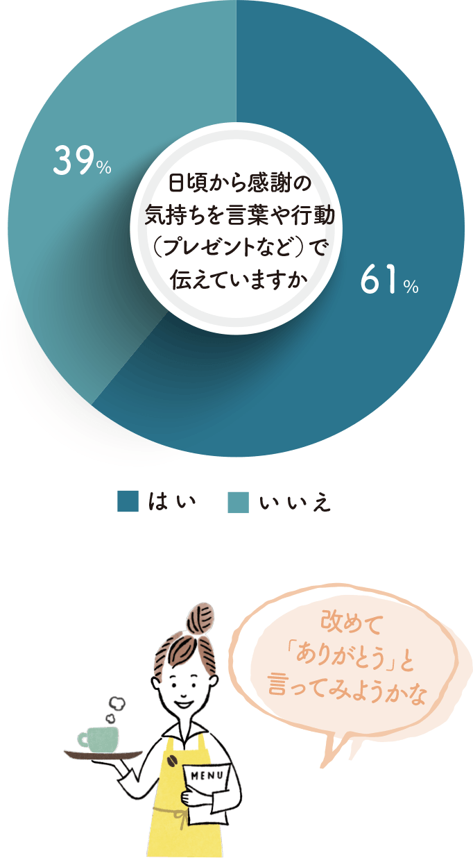 また「今までは言わなくても・・・と思っていたが、このアンケートを見て、やっぱりちゃんと感謝を伝えたほうがいいかな、と思った」というお言葉も。「伝えられていない」と回答されたみなさん、この機会にチャレンジしてみませんか?
