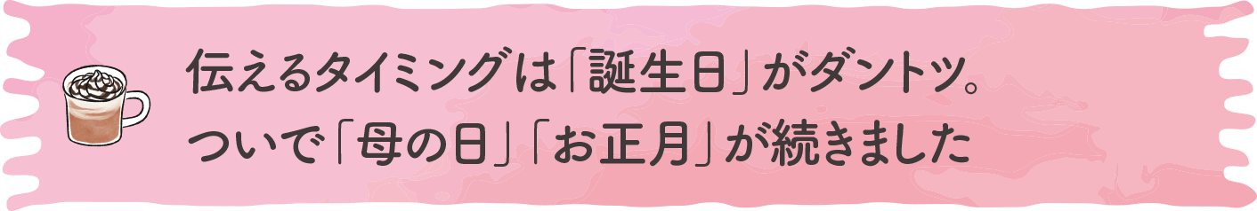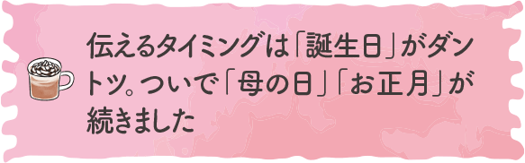ではいつ伝えるのか?を伺ったところ、相手にとって特別な日である「誕生日」を選んだ方が最多でした。なかには「自分の誕生日にケーキを買って実家に帰り、丈夫な体に産んでくれてありがとうと伝えました」という素敵なエピソードも。