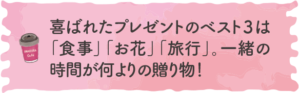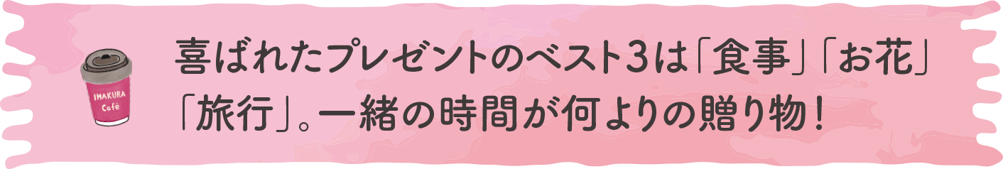 選ばれているプレゼントは、お花やお菓子なども多かったのですが、「食事」や「旅行」などの「時間」系が目立つ結果に。