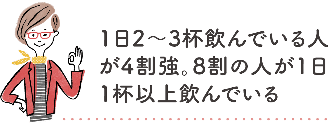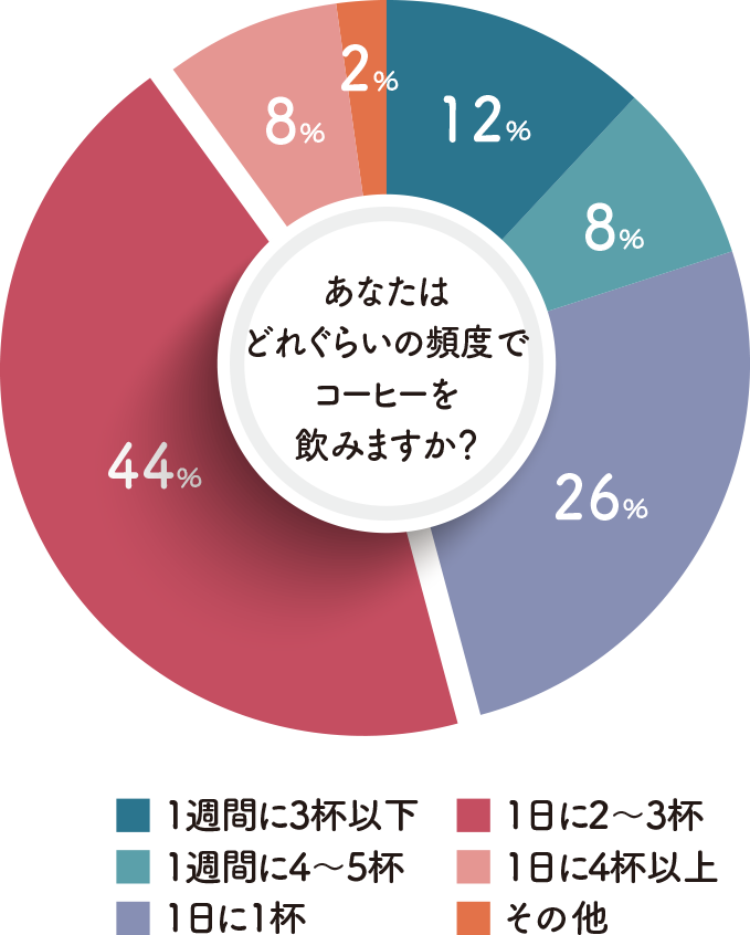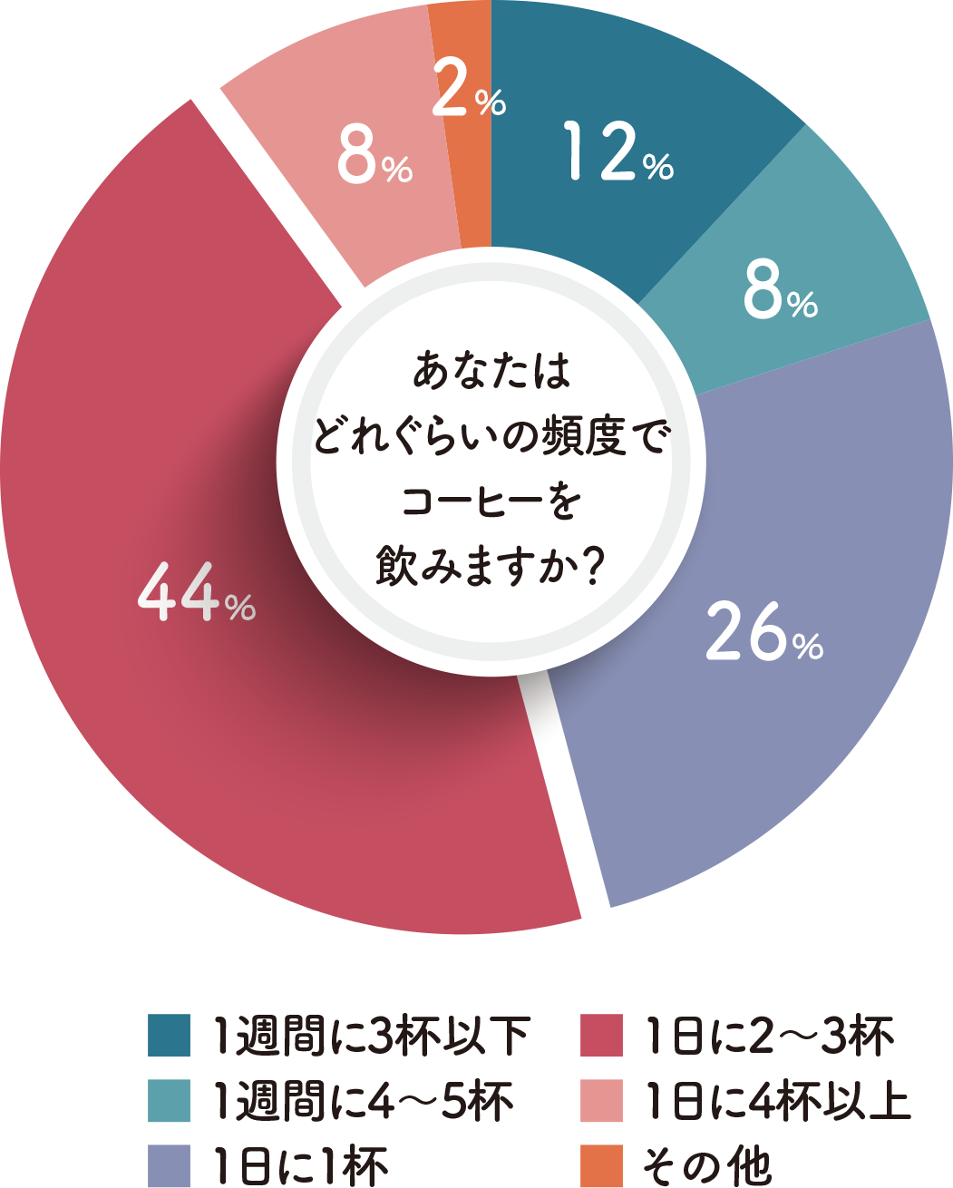 コーヒー好きの会員のみなさんは、どのぐらいコーヒーを飲んでいるのでしょう?頻度を尋ねたところ、「1日に2〜3杯」が44%で最多でした。「1日1杯」の26%、「1日に4杯以上」の8%と合わせると、78%の人が1日に1杯以上コーヒーを飲んでいることになります。一方、「1週間に3杯以下」、「1週間に4〜5杯」の人は合わせて20%で、コーヒーブレイクがしっかりと生活に溶け込んだ習慣になっているようです。