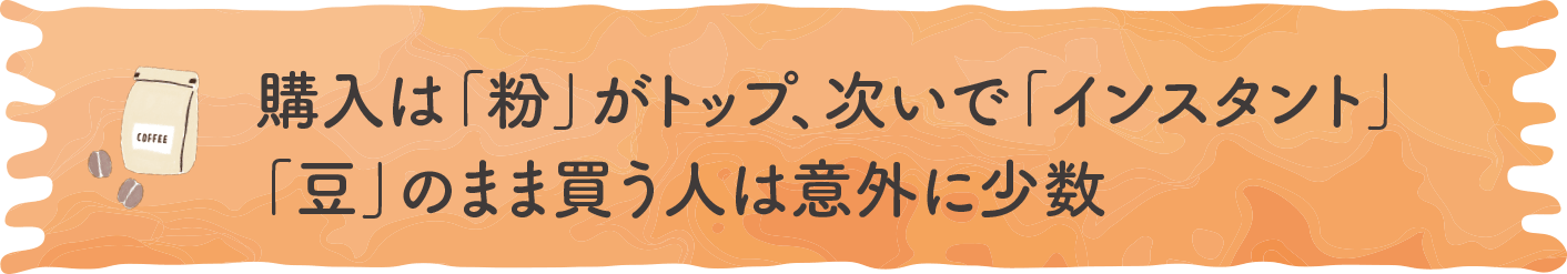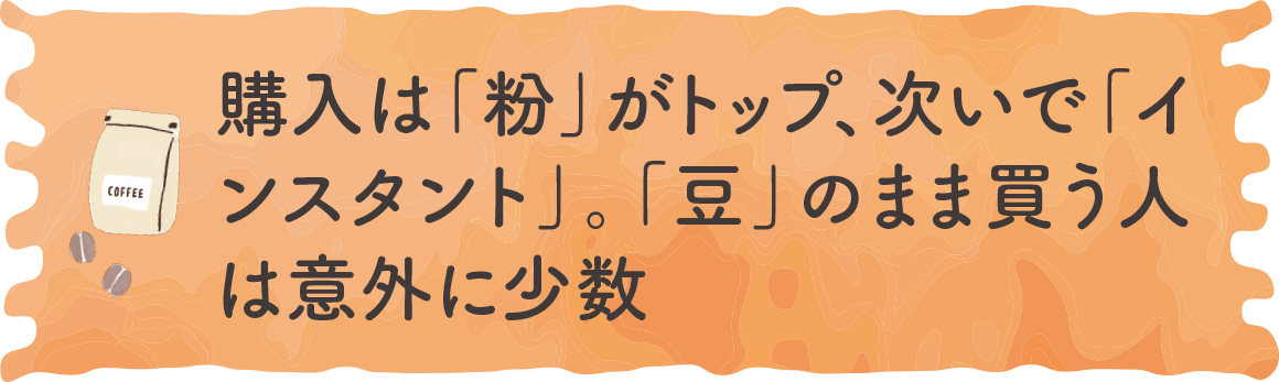 あなたは自分でコーヒー豆を挽く派?挽いてある粉を購入する派?それともカップオンタイプの簡易ドリップ型を使う?会員のみなさんに購入するコーヒーの状態を聞いてみたところ、トップは粉で37%。次いでインスタントが27%。豆のままの状態で買う人は16%と意外に少数で、簡易ドリップ型(14%)と拮抗しています。挽くというひと手間、忙しいときはけっこう面倒ですものね。簡易ドリップ型コーヒーはやや割高なものの、手間をかけずに本格的なコーヒーを淹れられる利点があります。