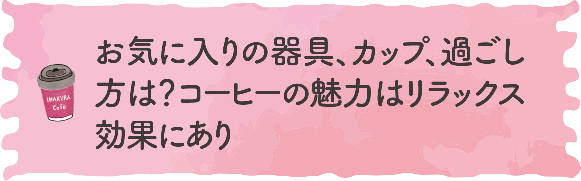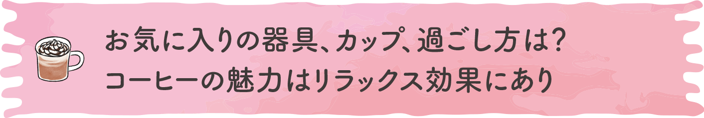 ご自宅でどのようにカフェタイムを楽しんでいるのか、教えてもらいました。「手挽きミルで豆を挽くのが楽しい」、「お湯は鉄瓶で沸かす」、「アルコールランプとサイフォンで淹れる」といった返答にコーヒー通のこだわりが感じられます。美味しく飲むにはカップも大事。「真空のステンレスカップを愛用。好みの温度がずっと保てるから」、「旅先で買った思い出のマグカップで飲んでいる」というご意見も。また過ごし方も「バルコニーで自然を感じながら飲むのが好き」、「音楽を聴きながらコーヒーをすする時間に小さな幸せを感じる」など。こだわりの器具やマイカップ、そしてお気に入りのシーンがあれば、カフェタイムが一層豊かになりそうです。