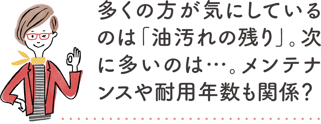 自由回答の質問にも関わらず「油汚れの残りが気になる」という声が多数の方から寄せられました。さらに「匂いがこもっている気がする」や「作動音の大きさ」など機能面のお悩みも…。