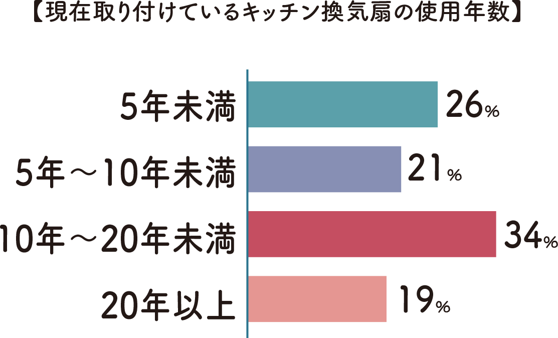 使用年数をお聞きしたところ、10年~20年が34%、次いで5年~10年が21%、20年以上が19%と、長く使われている方が多い傾向にありました。そのせいか「掃除を定期的にしていても匂いをしっかりと吸い取ってくれない」や「料理をした後の匂いが、やはり以前より取れない気がします」など、「掃除しているのに」と感じられている方も多いようです。そうなんです!機器には交換適齢期があるんです。