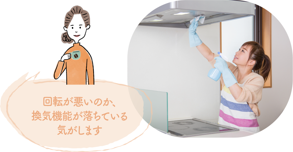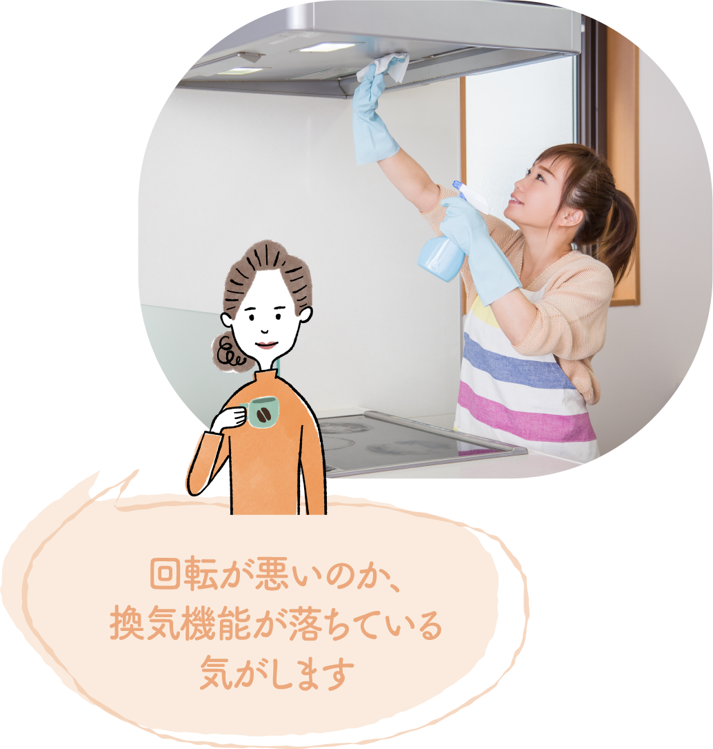 換気扇のお悩みを解決するには、まず「お掃除」です。使用開始から5年以内くらいでしたら、「一度ハウスクリーニング業者に依頼したら換気扇がきれいになり、軽く回るようになった」という声のように、きれいにすることで解決する場合もあります。面倒なファンの分解掃除や、自分ではできないダクト掃除などはプロに依頼しましょう。