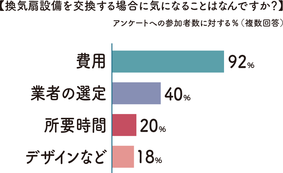 換気扇の交換で気になることは断トツで「費用」。アンケートにご参加いただいた方のうち90%以上の方が挙げられました。