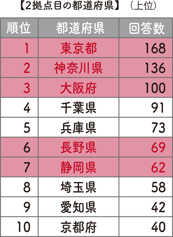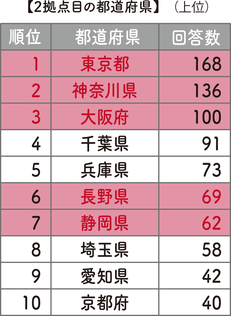 さっそく回答を見てみると、みなさんけっこう現実的でした。2拠点目の最多は東京都で、次いで神奈川県、大阪府、千葉県、兵庫県と続きます。