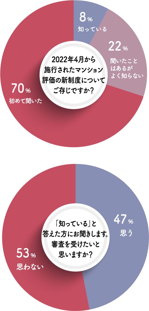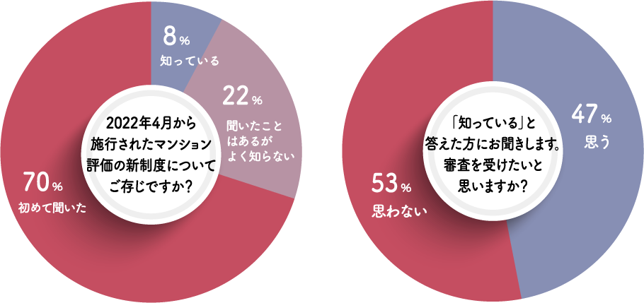 昨年4月に施行されたマンションの新制度を「知っている」と答えた方は8%。「聞いたことはあるがよく知らない」方と合わせてもわずか3割ですので、まだまだ知られていない様子です。ただ、知っている方の約半数が「審査を受けてみたい」と答えていらっしゃるので、内容を知ることで関心が高まるようですね。