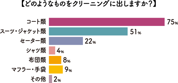 クリーニングに出したほうが、傷まなくていいのは分かっているけれど、家庭の洗濯機で洗えそうなものは躊躇しますよね。みなさんがどんな冬物をクリーニングに出しているか、気になるところです。アンケートの結果を見ると、トップはコート類(75%)でした。次いでスーツ・ジャケット類(51%)、セーター類(22%)と続きます。やはり長持ちさせたい衣類や型崩れしやすい衣類を優先してクリーニングに出していることが分かります。