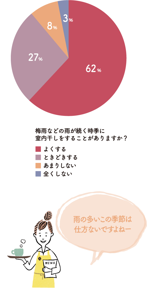 毎日のように雨が続くと、洗濯物をどうやって乾かそうかと頭を抱えてしまいますよね。会員のみなさんに、梅雨シーズンに部屋干しをするかどうかを尋ねたところ、「よくする」と答えた人は62%と、半数以上が部屋干し派であることが明らかになりました。「ときどきする」と合わせると89%と、実に約9割にも上ります。ちなみに「あまりしない」は8%、「全くしない」はわずか3%でした。ほとんどの人が部屋干しをしているのですね!