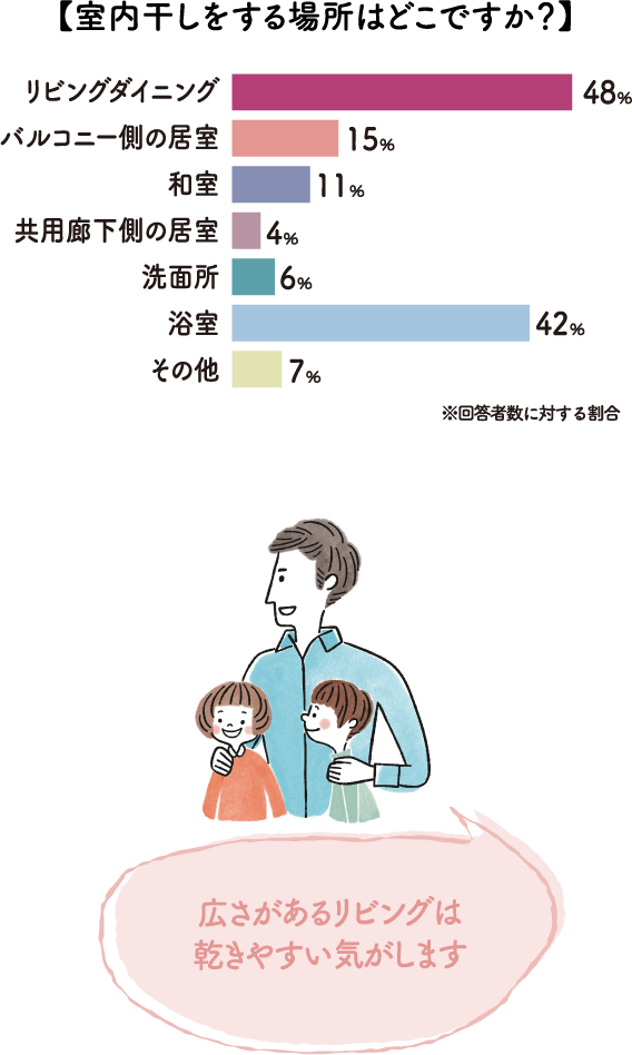 みなさんが洗濯物を住まいのどこに干しているのかも気になります。アンケート結果を見ると、一番多かったのは「リビングダイニング」(48%)。次いで浴室(42%)でした。リビングダイニングは部屋が広くて部屋干しのスペースを取りやすく、長くいる場所だからこまめに乾き具合を見られるメリットもありそう。浴室は干していても目障りにならず、浴室暖房乾燥機が付いている家庭も多いからでしょうか。続いて「バルコニー側の居室」(15%)、和室(11%)という結果でした。生活のメインとなる場所以外の部屋に干して、普段の動線の邪魔にならないようにしている方もいるようです。