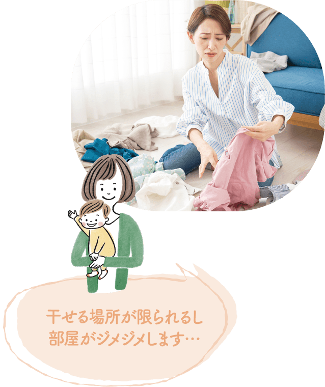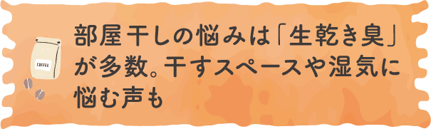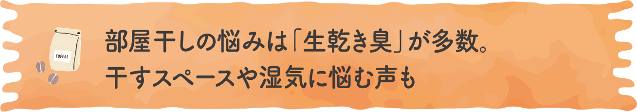 湿気が多い時季の部屋干しは、さまざまな困りごとが起こりがち。不快に感じながら我慢しているケースも多いのでは?どんなことに悩んでいるのか、みなさんに聞いてみました。多くの人が挙げたのは「生乾きのイヤな臭い」や「なかなか乾かない」問題。部屋干しは乾くのに時間がかかるため、洗い落とせなかった汚れの酸化や雑菌の繁殖が進み、臭いが発生してしまうのです。さらに、「干す場所が邪魔」、「干している間、部屋が使えない」、「リビングの見栄えが悪い」といった干すスペースに苦慮している様子や、「カビが生えそう」、「部屋がジメジメする」といった湿気に困っている人も少なくありませんでした。
