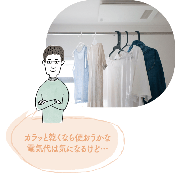 ちなみに浴室暖房乾燥機の電気代は、メーカーや機種によって多少の差はあるものの、1時間で約46.5円程度(※)。3時間で約140円です。これを高いと感じるか感じないかは人それぞれですが、天気に左右されずに洗濯物を干せて、浴室のカビ対策にもなるのはうれしいメリットですよね。洗濯物の間隔を空けて干したり、サーキュレーターを併用したりといった工夫をすることで、電気代を抑えながら効率的に使えますから、上手に活用してはいかがですか?