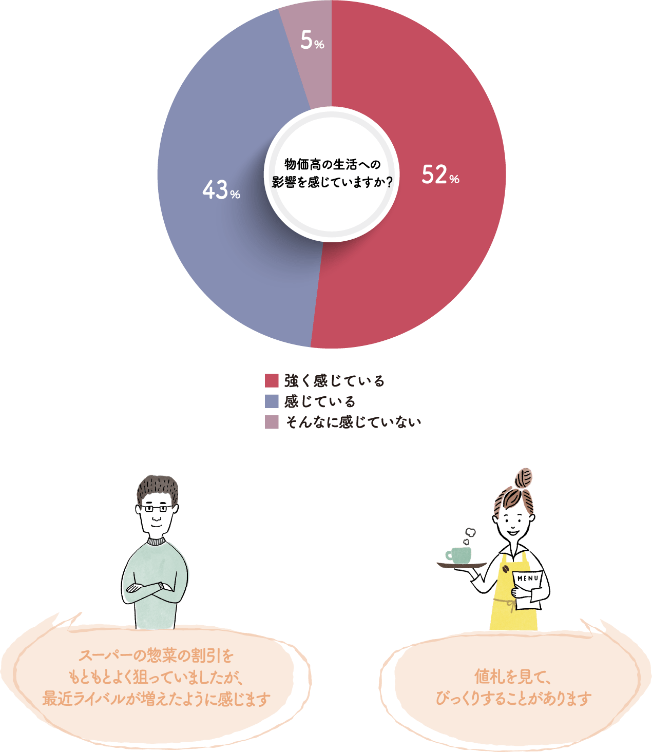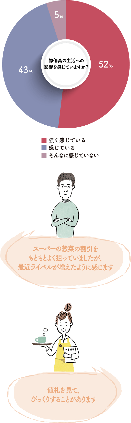 まずは「物価高の生活への影響を感じていますか」とお聞きしたところ、52%が「強く感じている」、43%が「感じている」、合計95%の方が「感じている」と回答。ほぼ全ての方が物価高を実感しているようです。半数以上の方が「強く感じている」を選択されたところにも、影響の大きさがうかがえますね!