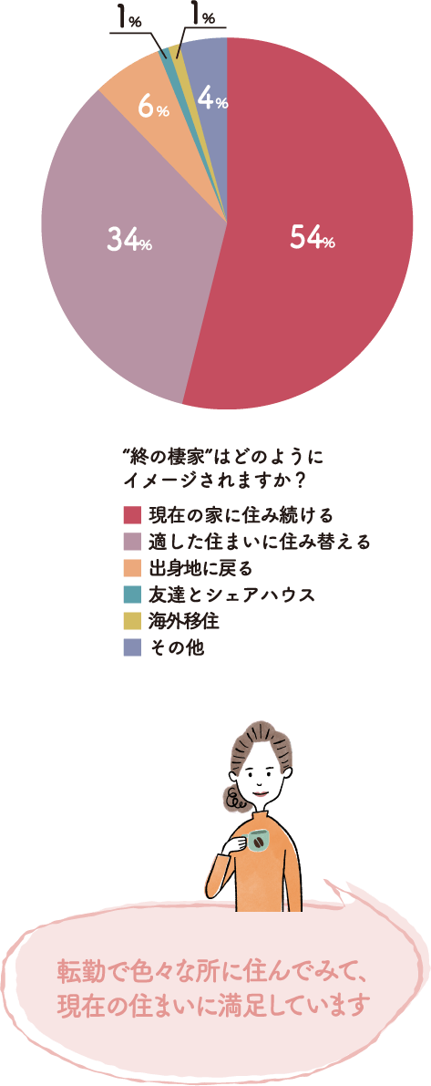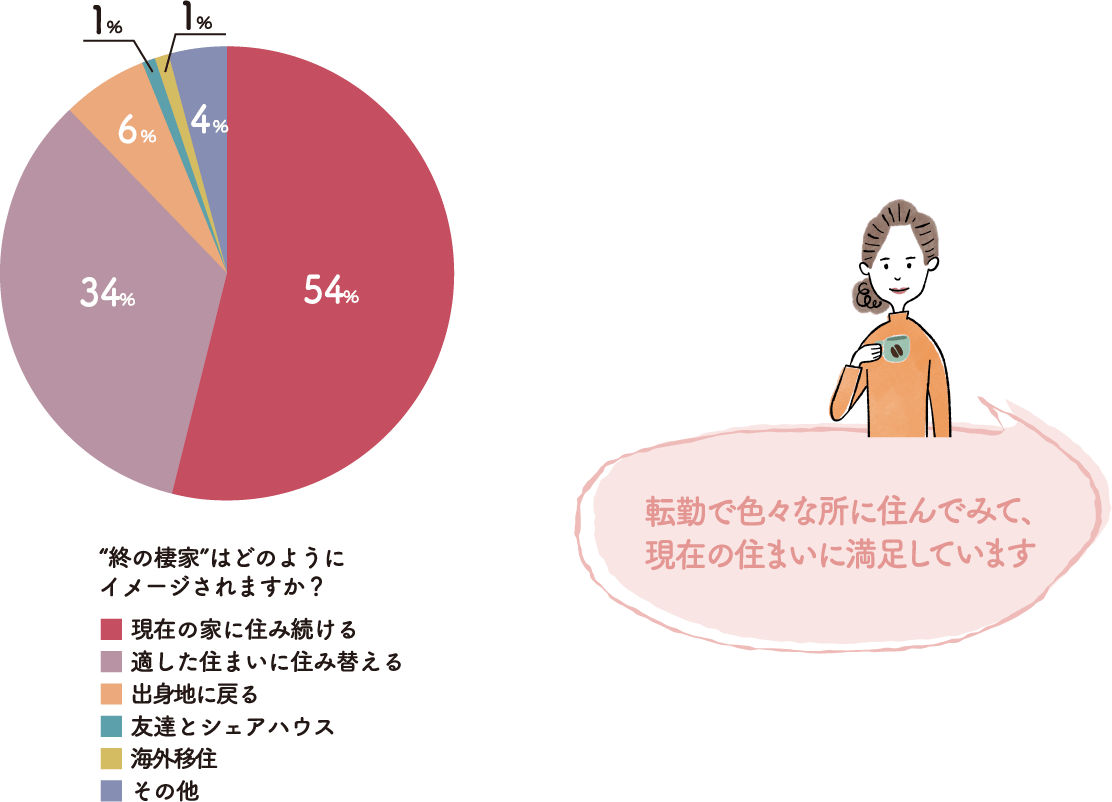 まずは「終の棲家」をどのようにイメージされているのかお聞きしたところ、「現在の家に住み続ける」(54%)が半数以上。次いで「適した住まいに住み替える」(34%)。「出身地に戻る」(6%)や「海外移住」(1%)、「友達とシェアハウス」(1%)は少なめでした。やはり住み慣れた我が家が一番のようです。