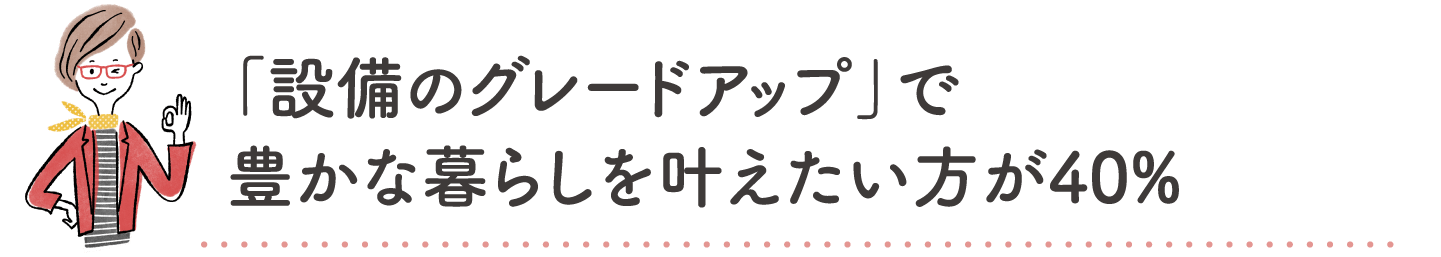 傷んだ箇所の修繕ではなく、暮らしを豊かにするためのリフォームをするとしたら、住まいの何を変えたいですか?会員のみなさんに尋ねたところ、「設備をアップグレードしたい」と答えた方が40%でトップでした。特に浴室やキッチン、トイレといった水まわりの設備って、新しいものほど機能もデザインもどんどん進化していて憧れますよね。次いで「内装・インテリアを変えたい」が33%、「間取り・動線をよくしたい」が30%でした。インテリアが素敵に変われば、毎日の気分も上がります♪「収納を増やしたい」が28%、「暑さ・寒さを軽減したい」が24%と続きました。