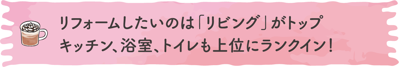 具体的にみなさんがリフォームしたいと考えているのは、住まいのどこなのでしょうか?最も多かったのは「リビング」で43%に上りました。家族みんなが集まる団らんの場をもっと居心地のよい空間にしたいという思いなのでしょう。次いで「キッチン」が36%、「浴室」が28%、「トイレ」が23%と上位にランクインしています。毎日使う水まわり設備は、家の中でも特に汚れや使い勝手が気になる場所。やはりここを新しくして快適に暮らしたい方が多いようです。そこで耳よりアドバイスを。時間や予算を掛けずに浴室を新しくしたい場合は、浴室リメイクという手もあり!浴槽を塗装し、浴室床のシートを貼り換えるリメイクでお風呂が新品同様に蘇りますよ。