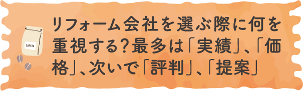 いざリフォームをしようと思ったとき、どんな会社に頼めばよいのか、良しあしの判断がつかなくて悩んでしまいがちですよね。会員のみなさんはリフォーム会社を選ぶ際に何を一番重視しているのでしょうか?最多は「実績」と答えた方で24%。ただし、「価格」と答えた方も23%に上り、結果は拮抗しました。「口コミなどの評判」(18%)や「プランや提案」(17%)を挙げた方も多く、人によって重視する点はさまざまのよう。ちなみに「知名度」は4%と意外に低い結果でした。