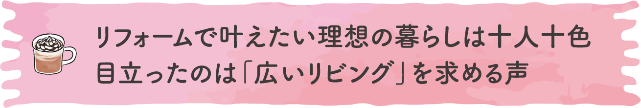では、みなさんは「我が家をもっと好きになる」ためのリフォームで、どんな理想の暮らしを叶えたいのでしょうか?「好きなインテリアに囲まれた暮らしがしたい」、「カウンターキッチンで家族とおしゃべりしながら料理がしたい」、「収納名人になって、もののないすっきりした部屋でくつろぎたい」など答えは十人十色。なかには「猫ちゃんファーストの家にしたい」という回答もありました。目立ったのが「広くて明るいリビング」を求める声。「広いリビングに大画面テレビを置いてゆったりとシアター気分を味わいたい」、「明るく開放的なリビングに友人を招いてホームパーティーを開きたい」という夢を語ってくれた方もいました。