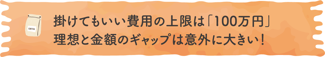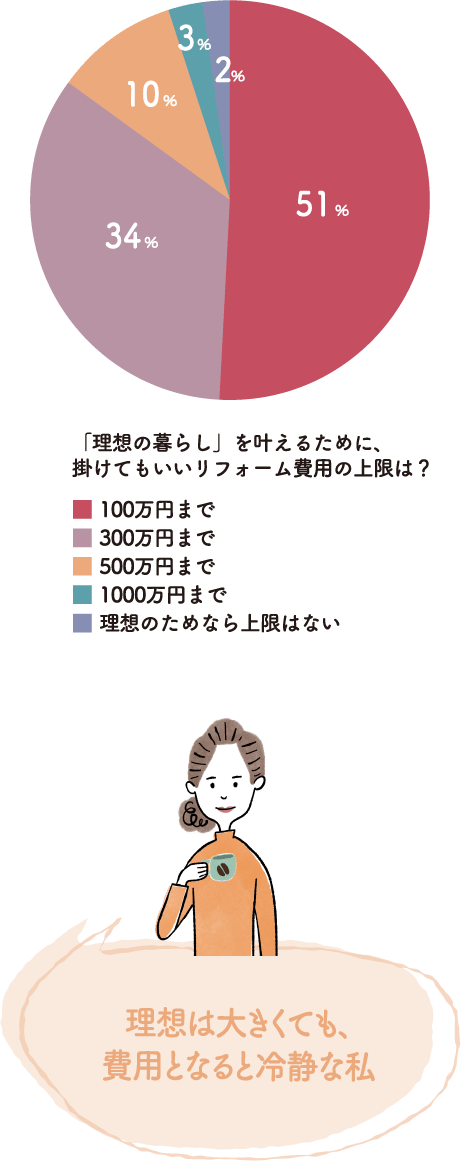 さて、リフォームで叶えたい夢はあれど、現実に戻ると気になるのが予算ですよね。「理想の暮らし」を叶えるために、どこまで財布の紐はゆるめられますか?みなさんに掛けてもいいリフォーム費用の上限を尋ねてみました。結果は何と51%と約半数の方が「100万円まで」という回答で、次いで「300万円まで」が34%でした。一方、「1000万円まで」と答えた方はわずか3%に過ぎません。理想と金額のギャップは大きいようです。物価上昇が目に付く今日この頃、みなさんの財布の紐はかなり固いことが分かりました。