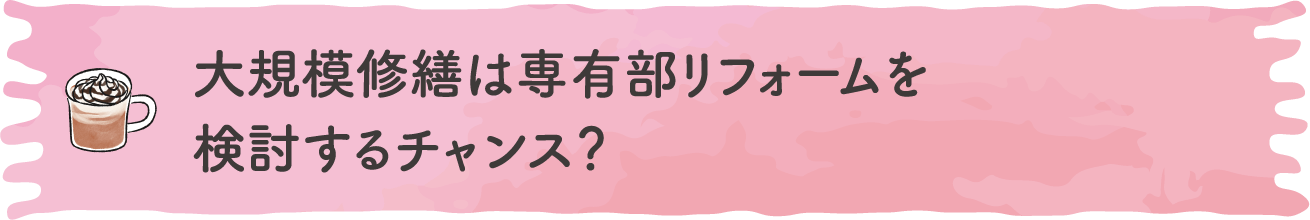 実はこの大規模修繕のタイミングに合わせて専有部のリフォームを行えると、工事の音に一人だけ気を使う必要がなくなるだけでなく、養生などの作業の手間が省け、改修コストにもメリットが生まれることがあるようですよ。