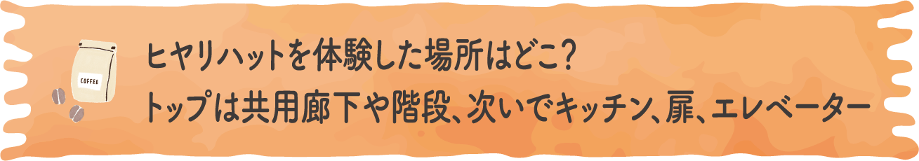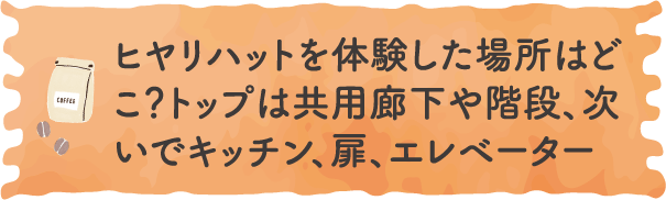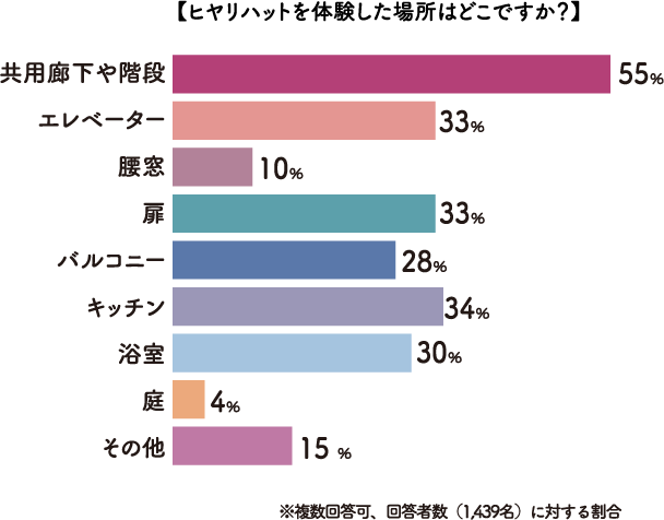 子どもにとって安全・安心な場所であるはずの自宅マンションでも、大きな事故につながる一歩手前の「ヒヤリ」とする出来事はたくさん起きています。みなさんにマンション内でヒヤリハットを体験した場所を聞いてみました。最も多かったのが「共用廊下や階段」の55%でした。共用廊下や階段って、油断すると子どもの遊び場になりがち。気を付けたいですね。次いで「キッチン」34%、「扉」33%、「エレベーター」33%、「浴室」30%、「バルコニー」28%と続きました。いずれも割合はそれほど変わりません。暮らしのさまざまな場所にヒヤリハットが潜んでいることが分かります。