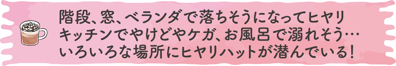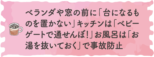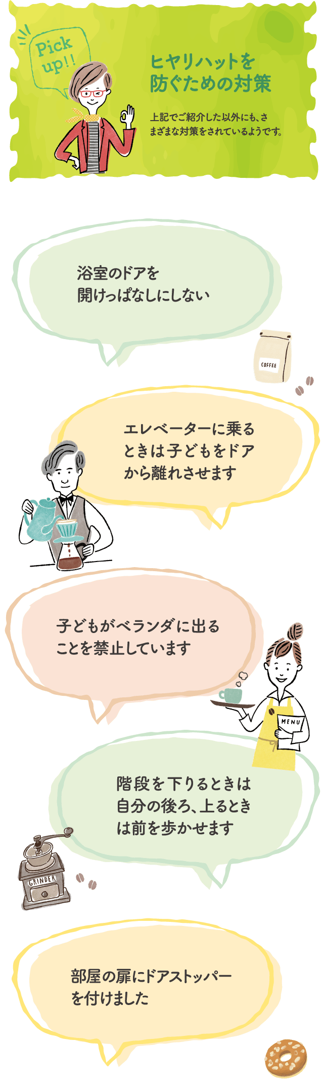 また、転落しそうになってヒヤリとするケースもよくあるようです。「開けていた腰窓から身を乗り出していた」「共用部の非常階段から転げ落ちそうになった」「ベランダに置いていた収納ケースに上って手すりから下を見ていた」といった声が上がっています。こうしたヒヤリハットは、どこの家庭でも起こりがち。見逃さずに対策につなげて事故を予防しましょう。