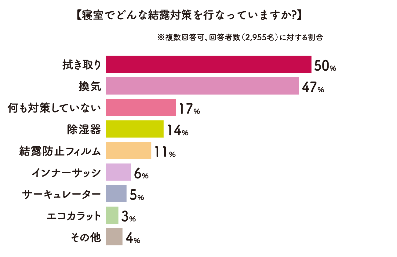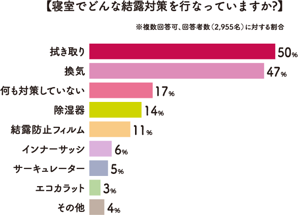 続いて「除湿機を使う」が14%、「結露防止フィルムを窓に貼る」が11%。さらに「インナーサッシを付ける」6%、「エコカラット(調湿壁材)を貼る」3%と、積極的に効果的な結露防止対策をしている家庭も少数ながらありました。