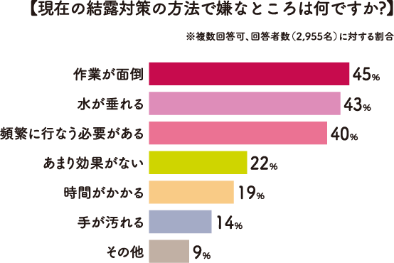 みなさんは現在の結露対策にどんな不満を持っているのか、嫌なところを聞いてみました。トップ3は「作業が面倒」45%、「水が垂れる」43%、「頻繁に行なう必要がある」40%という結果に。また、「あまり効果がない」と嘆く人も22%に上りました。