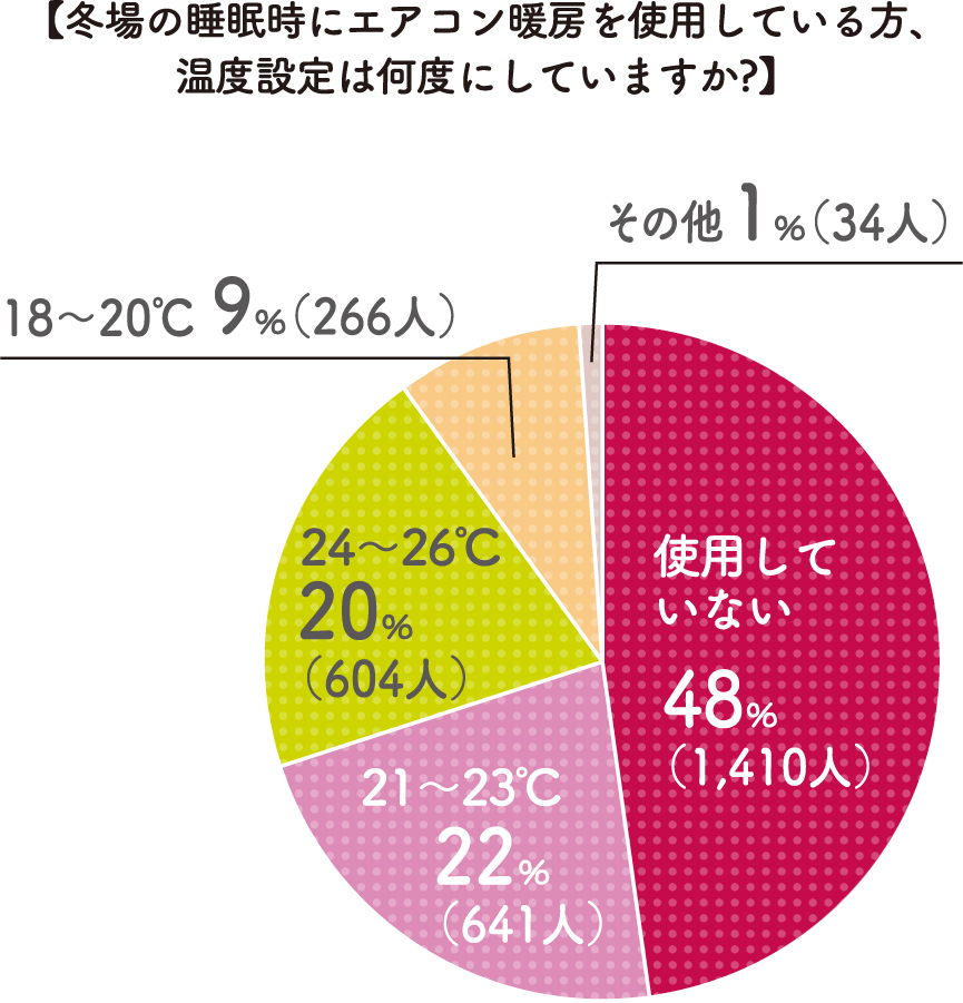 結露を防ぐには就寝時のエアコン暖房の温度にも気を配りたいところです。そこで、みなさんに冬場の睡眠時の設定温度を尋ねてみました。すると、48%、つまり約半数の人はエアコン暖房を使っていないことが判明しました。一方、エアコン暖房を使用している人は、「21〜23℃」の設定が22%と最多。次いで「24〜26℃」が20%。「18〜20℃」と低めの人も9%に上りました。
