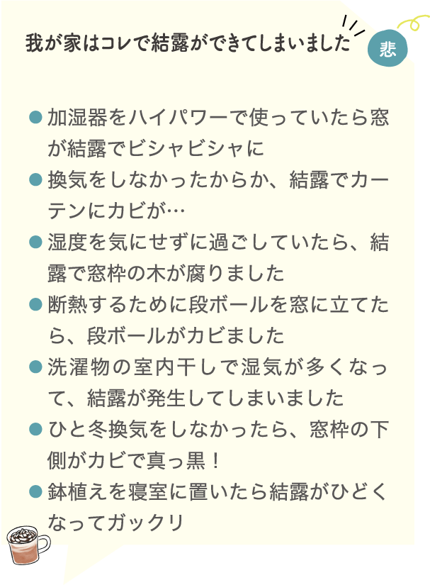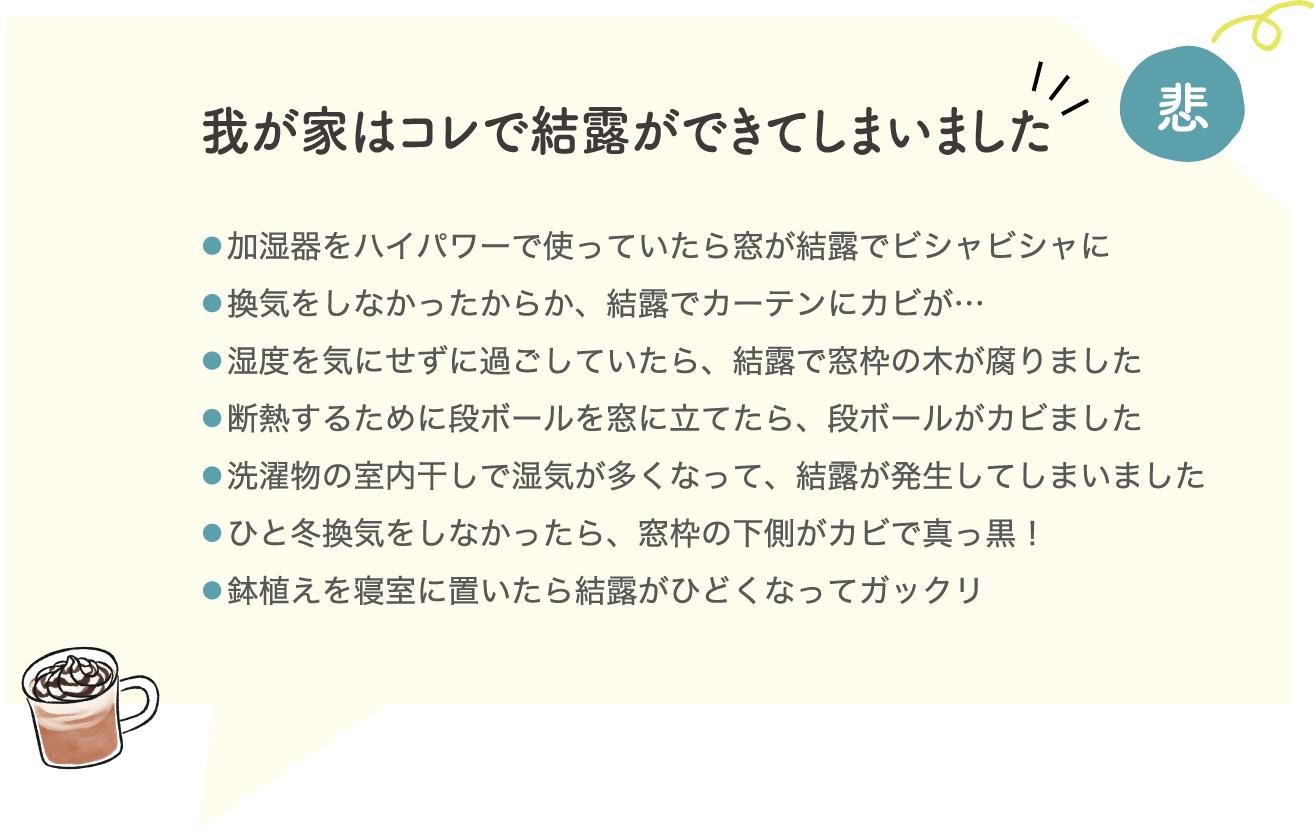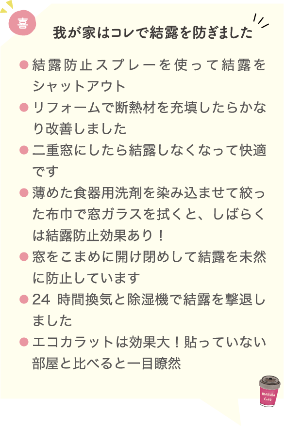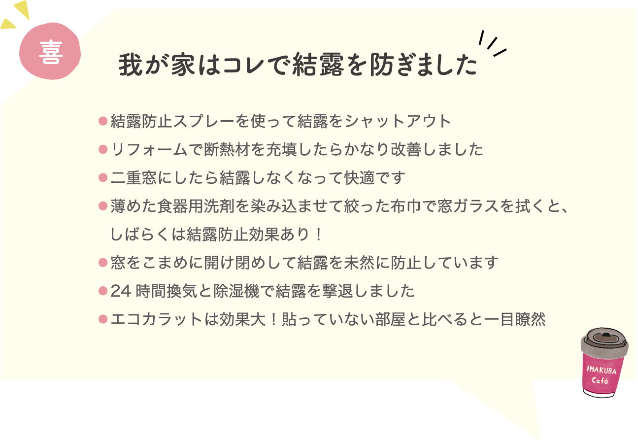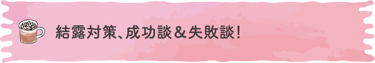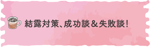結露しないか心配な人、結露を何とか解消したい人はご注目。みなさんに結露対策の成功談、失敗談を聞いてみました。笑顔あり、涙あり!体験者が語るリアルな声をぜひこれからの結露対策の参考にしてくださいね。