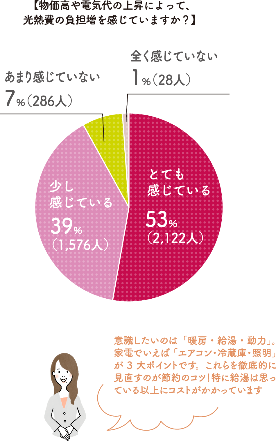 物価高、とりわけ光熱費の高騰が家計に大きな影響を与えている昨今。暖房や給湯器を使用するたびに、「今月はいくらかかるのかしら」と気になる人も多いのでは?会員のみなさんに光熱費の負担増を感じているかどうかを尋ねたところ、やはり「とても感じている」(53%)、「少し感じている」(39%)と、約9割が負担増を感じている結果になりました。特に電気代の高騰が家計を圧迫し、みなさん頭を抱えているようです。