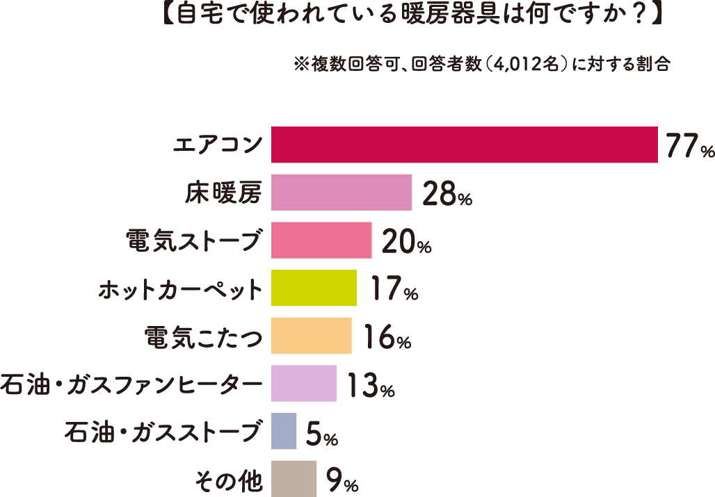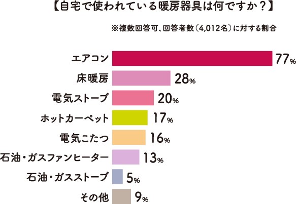 冬の寒さを乗り切るために欠かせない暖房器具。普段みなさんは何を使っているのでしょうか?1位はダントツで「エアコン」。77%を集めました。手間がかからず、部屋全体をすぐに暖めてくれるエアコンは、もはや住まいの必需品ですよね。2位が「床暖房」(28%)。床が暖かいと足元の冷えも解消できて快適です。続いて「電気ストーブ」(20%)、「ホットカーペット」(17%)、「電気こたつ」(16%)、「石油・ガスファンヒーター」(13%)という結果になりました。石油・ガスストーブは5%と少数でした。
