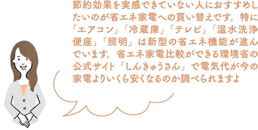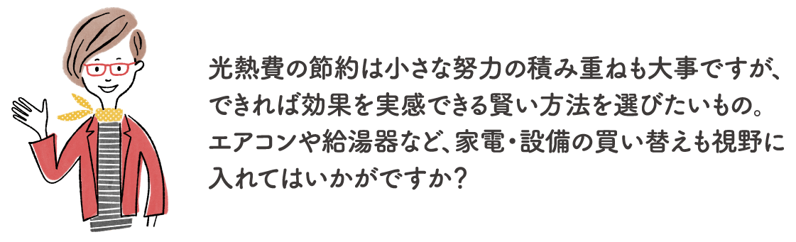 光熱費を節約したいなら、古い家電や設備を新しい製品に替えるのも賢い手。そこで買い替えたい家電や住宅設備を聞いてみたのですが、「買い替える予定がない」人が50%と半数に上りました。みなさん、まだ使えるものは買い替えないで、支出を抑えていることが分かります。買い替えを考えている人の回答は「エアコン」が20%でトップ。次いで「冷蔵庫」(16%)、「照明器具」(11%)、「給湯器」(10%)、「テレビ」(9%)という結果でした。