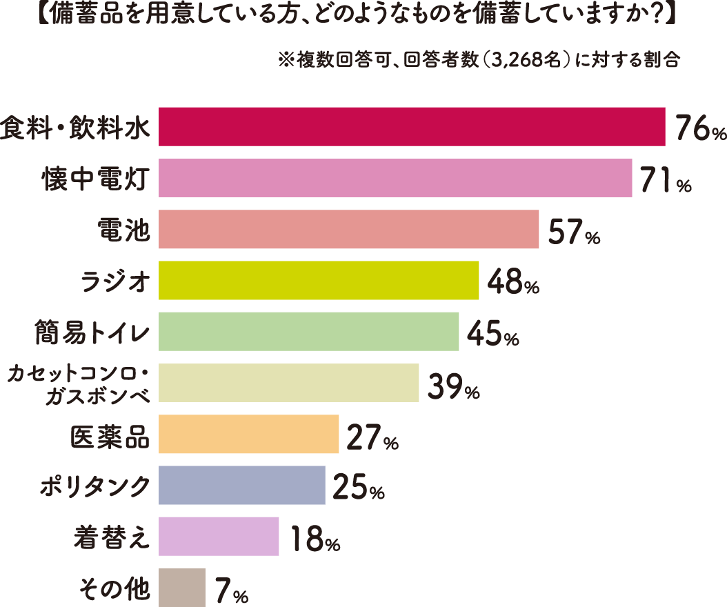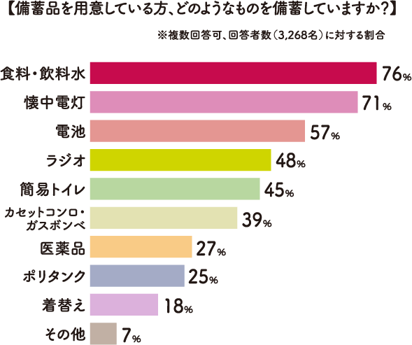 では備蓄している人はどのようなものを用意しているのでしょうか?最も多かったのは「食料・飲料水」、「懐中電灯」で、7割以上の人が備蓄していると回答されました。ちなみに防災士の方によると、懐中電灯などは複数用意して家のさまざまなところに置いておくのがおすすめだそうです。