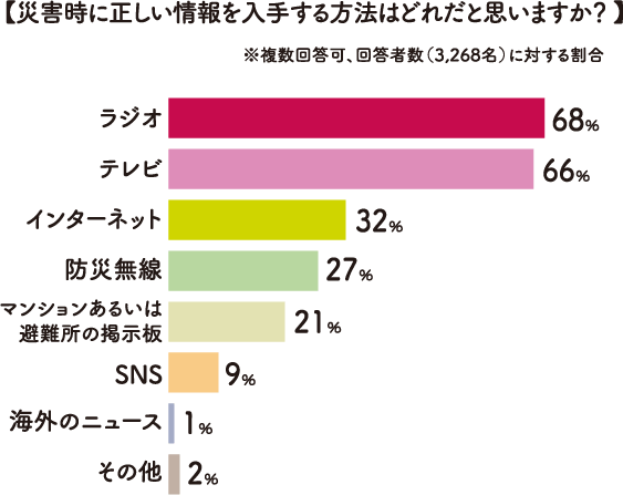 また、約半数の人が用意している「ラジオ」は、「正しい情報を入手する方法」としても最も多く選ばれました。昨今はインターネット情報の見極めが難しくなっていることもあり、災害時の情報源として注目されているようです。