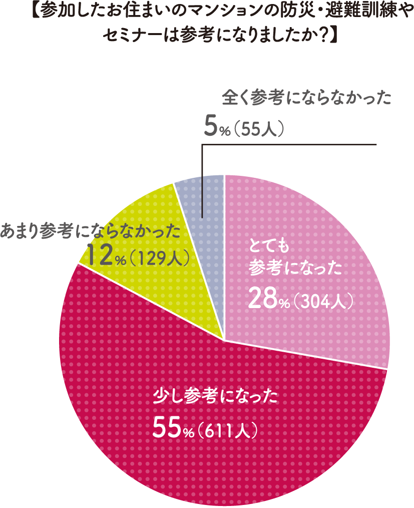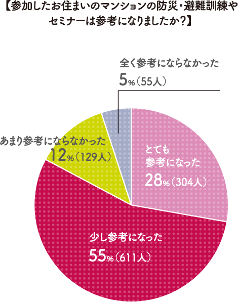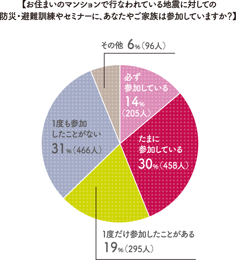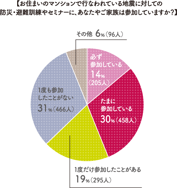 災害が起きた際に円滑に「共助」を実施するためには、平時からの備えが大切です。ところが、お住まいのマンションでの防災・避難訓練やセミナーの実施状況をお聞きしたところ、27%の人が「分からない」と回答、実施しているマンションでも31%の人が「一度も参加したことがない」という、ちょっと残念な結果となりました。