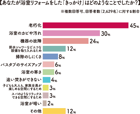 【あなたが浴室リフォームをした「きっかけ」はどのようなことでしたか?】※複数回答可、回答者数(2,629名)に対する割合 老朽化45% 浴室のカビや汚れ30% 機器の故障24% 節水シャワーなどエコな設備を取り入れるため12% 掃除のしにくさ8% バスタブのサイズアップ6% 浴室の寒さ6% 追い焚きができない4% 子どもも大人も、家族全員が楽しめる空間にするため3% スパのようなリラックスできる空間にするため3% 浴室が暗い2% その他12%