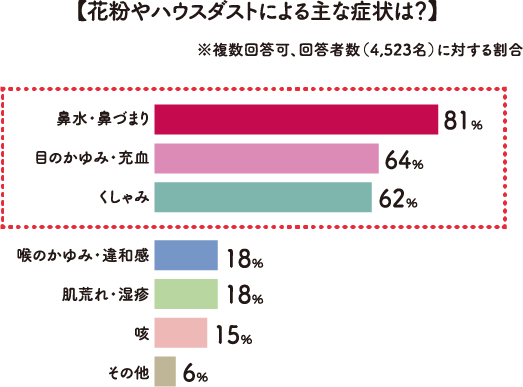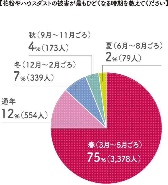 花粉やハウスダストによる健康被害が最もひどくなる時期は、「春」と答えた人がダントツ。やはりスギ、ヒノキなどの花粉が大量に飛散する時期に、苦しい思いをしているようです。「秋」、「冬」も見逃せません。秋にはブタクサやヨモギなどの草花が花粉を放出し、冬にはイネ科植物がアレルギーの原因となることも……。また、秋から冬にかけては室内で過ごす時間が増えるため、ハウスダストによるダニアレルギーが悪化しやすくなります。